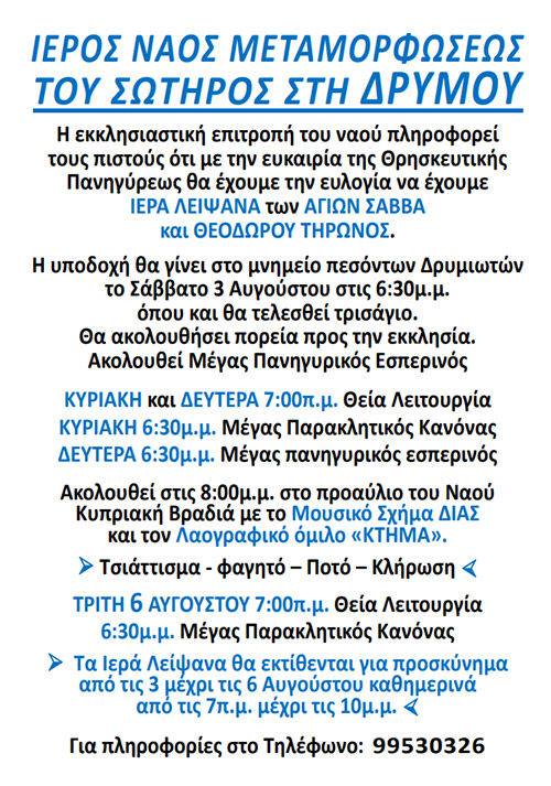 Εκδηλώσεις για τη γιορτή της Μεταμορφώσεως του Σωτήρος 3-6/8/2019